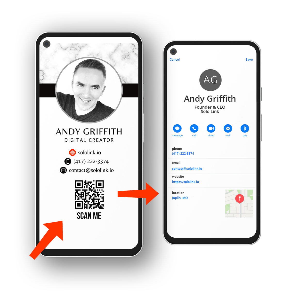 No app needed, just share your Solo Link via text or in person to have all of your contact information saved directly to any contacts phone.
